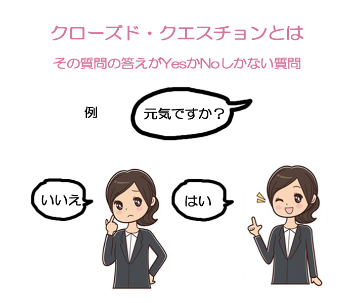 具体的には、相手の答えが「はい」か「いいえ」のどちらかに限定される質問です。