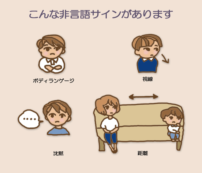 ※下記に紹介する例は一般的に知られている非言語サインです。必ずしも全てのサインが気持ちを特定できる物ではないので、話し合いのひとつの手がかりとして参考にしてください。